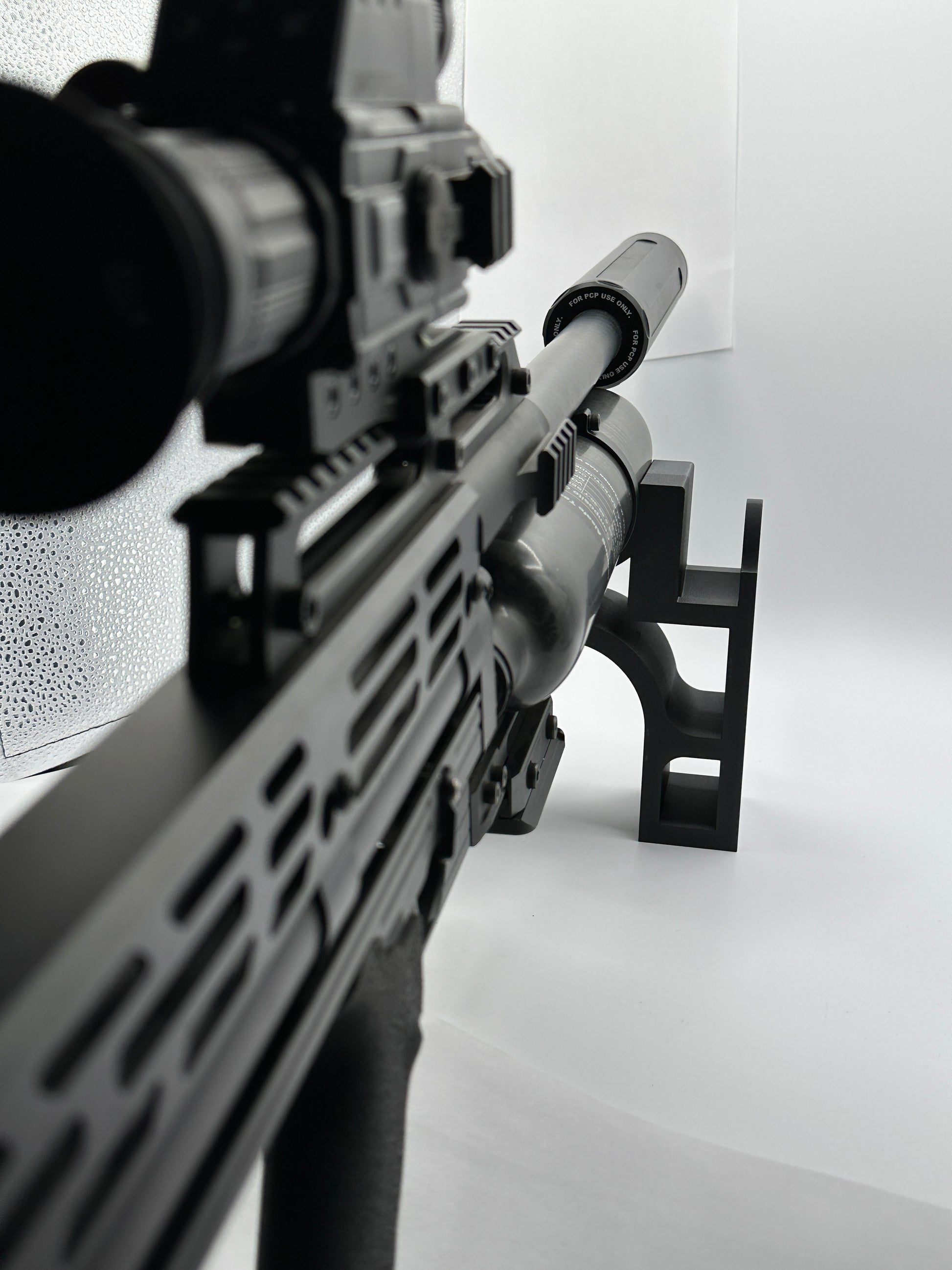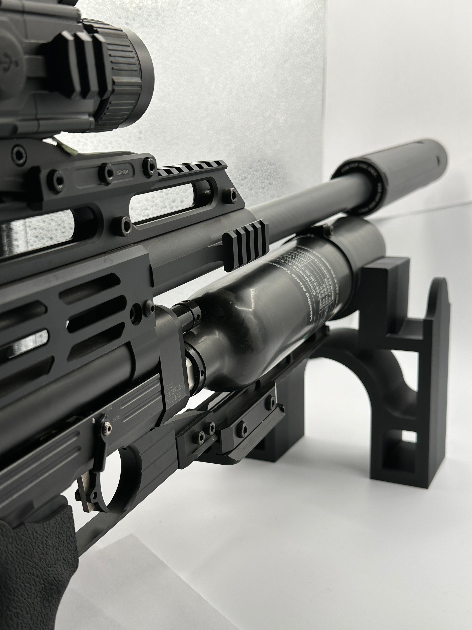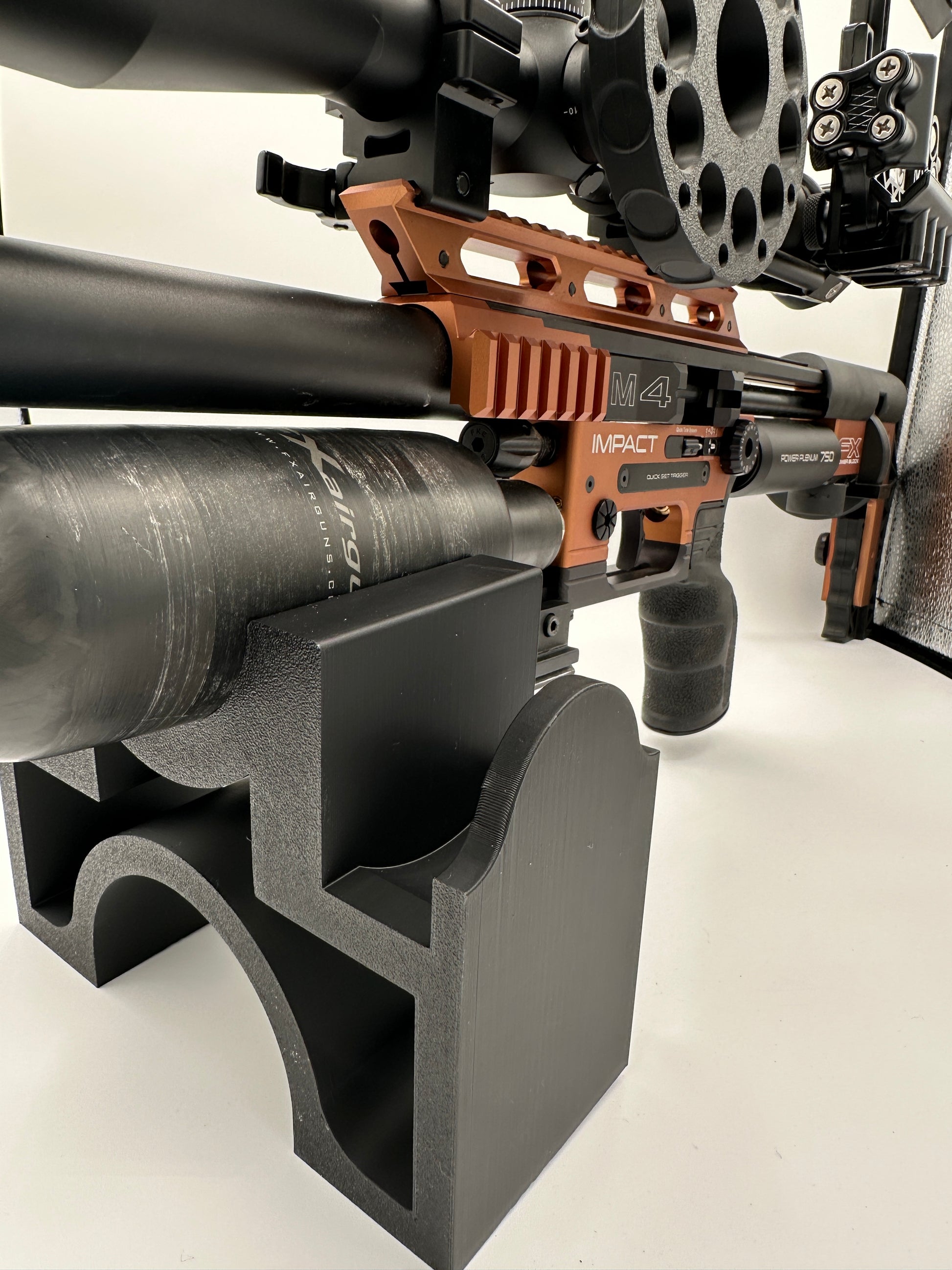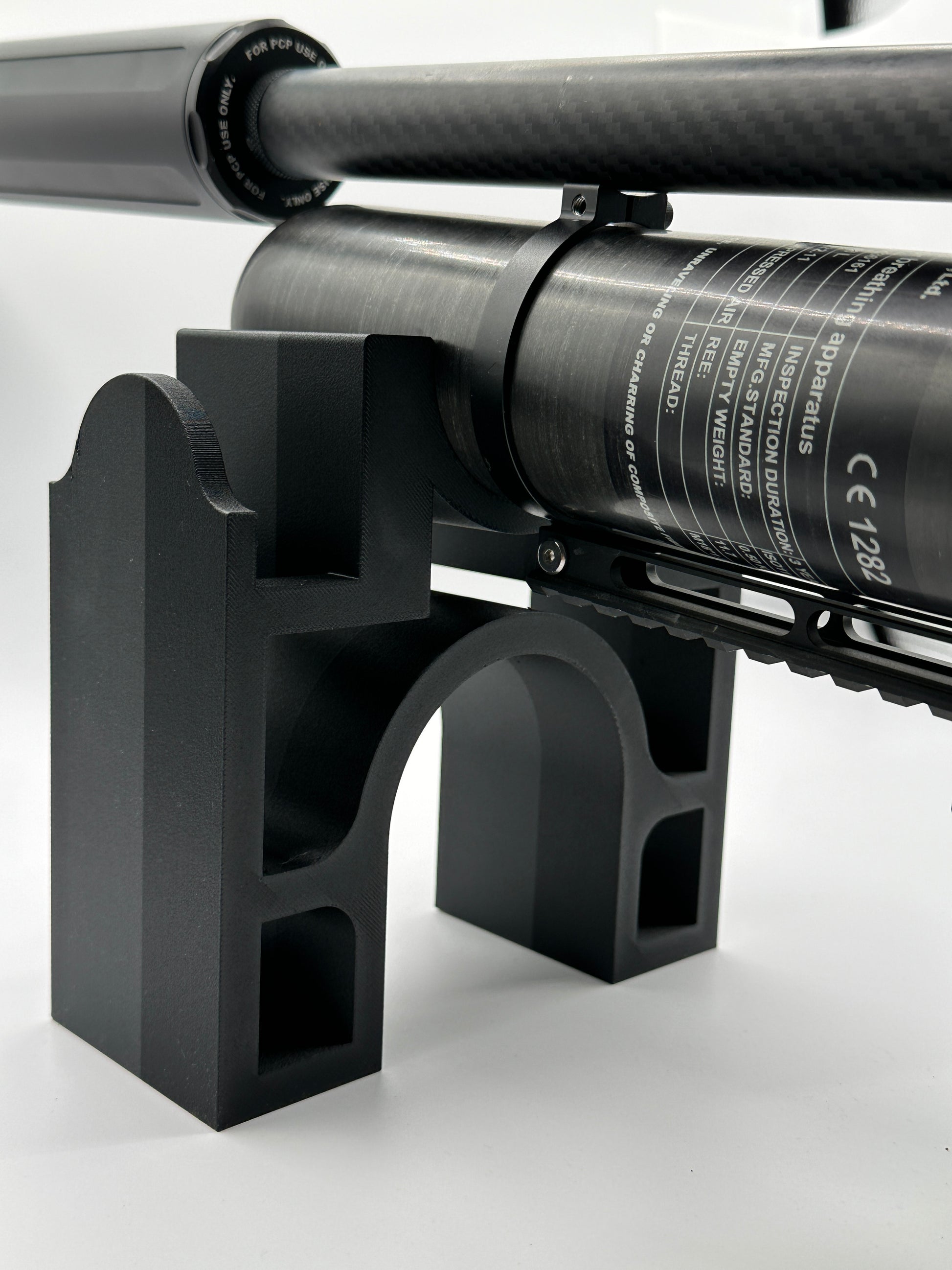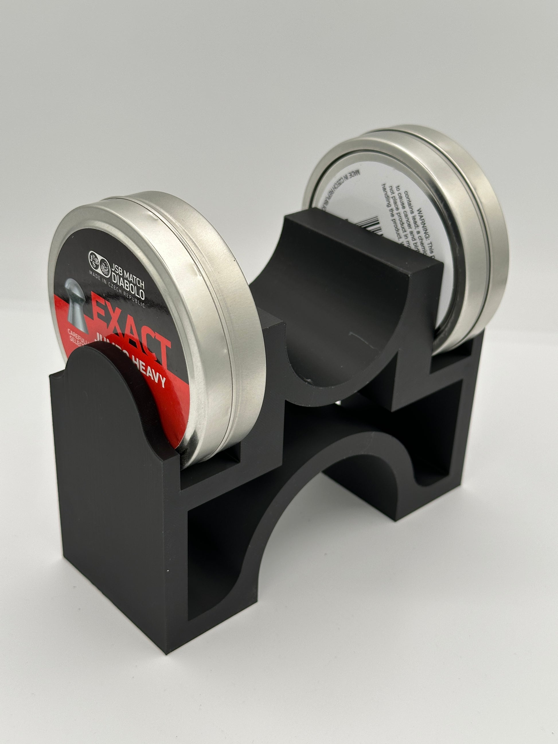 Introducing our Dual-Tin Air Rifle Display Mount, the perfect solution for securely showcasing your air rifle while keeping your pellets conveniently within reach. Designed specifically for air rifles with 60 mm air bottles, this sleek and durable mount features integrated holders for two pellet tins, ensuring you're always prepared for your next session. Crafted with precision and built to last, the display mount not only organizes your gear but also highlights your rifle with style. Whether for personal use or as a professional display, this mount combines functionality and aesthetics for the ultimate air rifle setup.